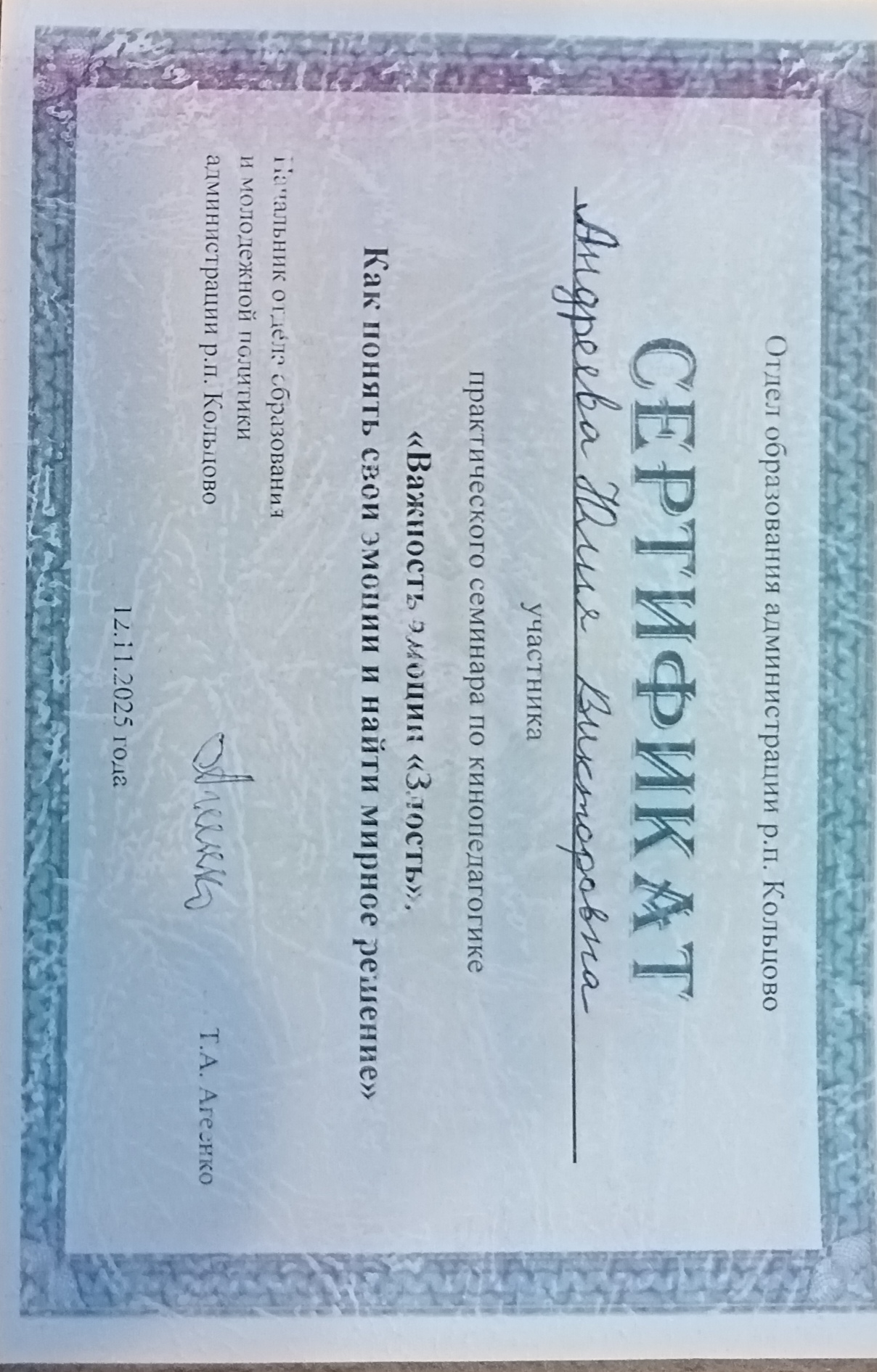 Сертификат участника практического семинара по кинопедагогике. Тема: Важность эмоции"Злость". Как понять свои эмоции и найти мирное решение". ноябрь 2025г.